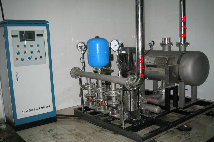 1, the equipment into the water: stainless steel water tank or self built pool of water outlet flange butt frequency conversion constant pressure water supply equipment inlet flange.